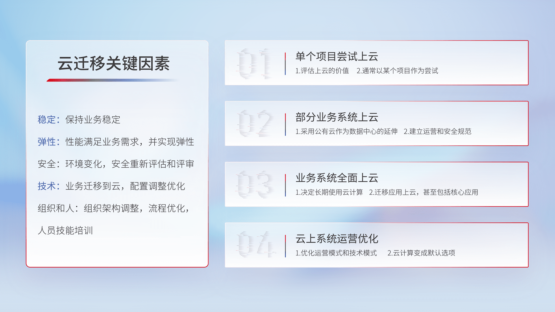 结合实际业务,,从规划设计、、、、云平台选型、、、、云原生改造、、、数据迁移、、、、集成交付,,迁移全过程为客户识别最佳上云路径,,做好风险识别管理,,设计网络架构、、、身份权限、、、、安全审计合规、、、操作审计、、、日志审计、、、、监控告警策略、、、多站点容灾设计等,,,,对云上基础设施进行整体规划,,提升IT治理水平,,,,以满足弹性、、、、高可用、、、、高性能的需求。。