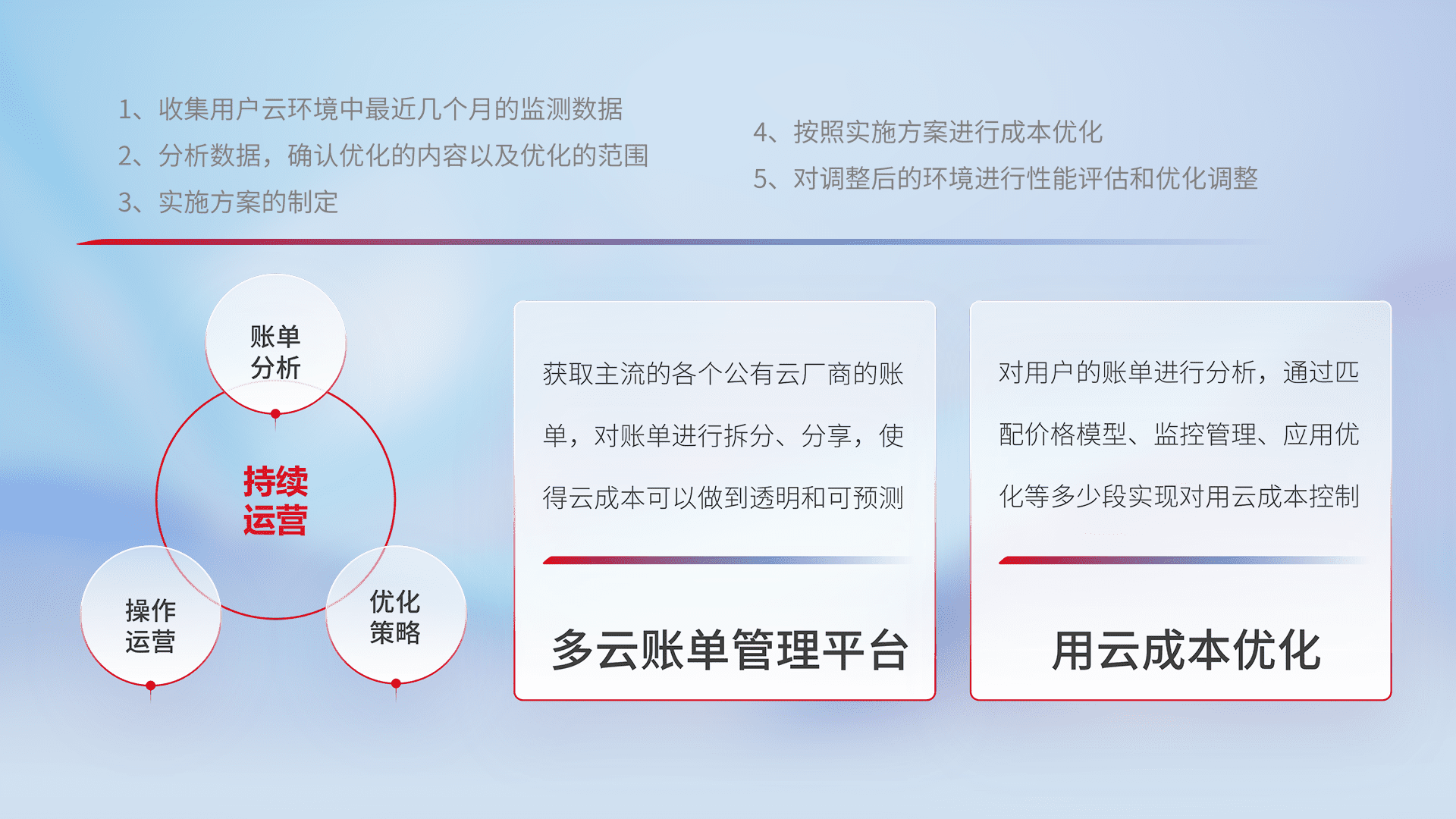 通过多云纳管,,,,以统一的资源数据模型把客户的云资源进行抽象和封装,,进而实现对多云资源的统一操作,,,保障云资源管理的可靠性、、、、稳定性与可用性。。。。量身定制化运维内容,,,,配置、、、、开发运维、、补丁管理、、、备份、、、监控、、、认证和访问管理、、、审计和日常巡检等,,,,保障在用云过程中的可靠度,,稳定度以及高可用率。。。