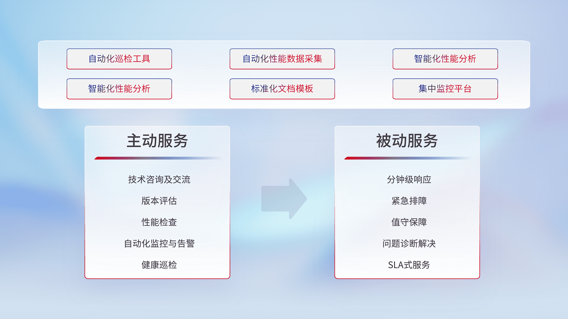 智能化工具和标准化文档,,保障服务质量,,提供主动服务(包含技术咨询、、、版本评估、、、、性能检查、、、自动化监控与告警、、、健康巡检)和被动服务包含(分钟级响应、、、紧急排障、、值守保障、、问题诊断解决、、SLA服务)。。。。